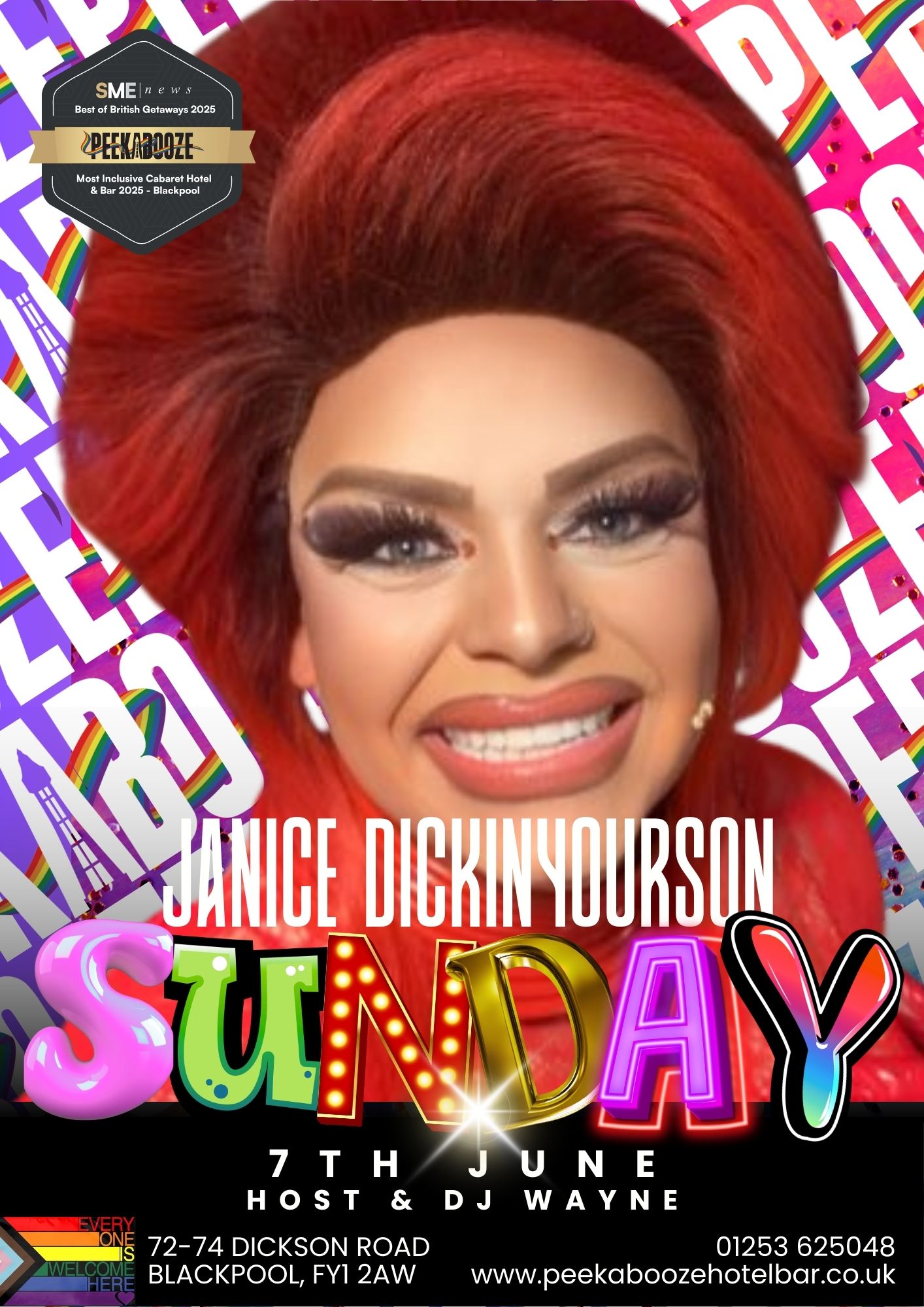 Pride Weekend ends with a bang as Janice Dickinyourson storms the PeekaBooze stage on Sunday 7th June! Expect outrageous comedy, fierce performances, and the kind of chaotic brilliance only Janice can deliver. She’s loud, she’s proud, she’s unfiltered, and she’s the perfect queen to bring Pride to a glitter‑drenched close. Get ready for a finale packed with laughs, anthems, and pure drag joy — the Pride send‑off Blackpool deserves.