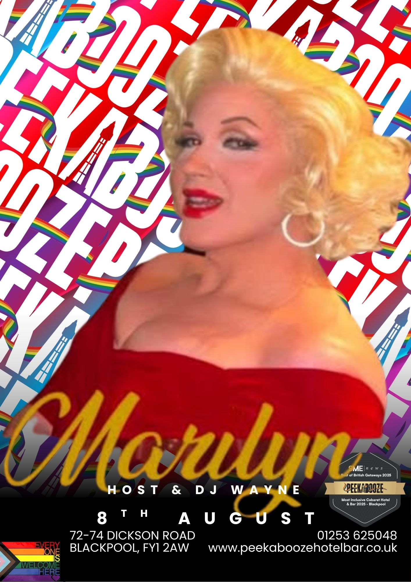 PeekaBooze proudly welcomes Santana Rouge for the first time on Saturday 8th August. With stunning stage presence, flawless delivery, and a show packed with charisma and style, Santana brings a fresh new flavour to the PeekaBooze stage. Expect glamour, humour, and top‑tier drag from a rising star you’ll be talking about all summer. A debut not to be missed.