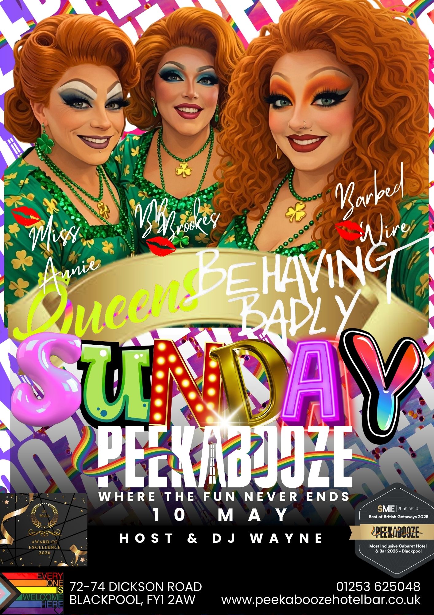 🌈 PeekaBooze Super Sunday Drag Show 💄 Featuring Queens Behaving Badly 📅 Sunday 10 May ⏰ 9:00 PM 📍 PeekaBooze, Blackpool