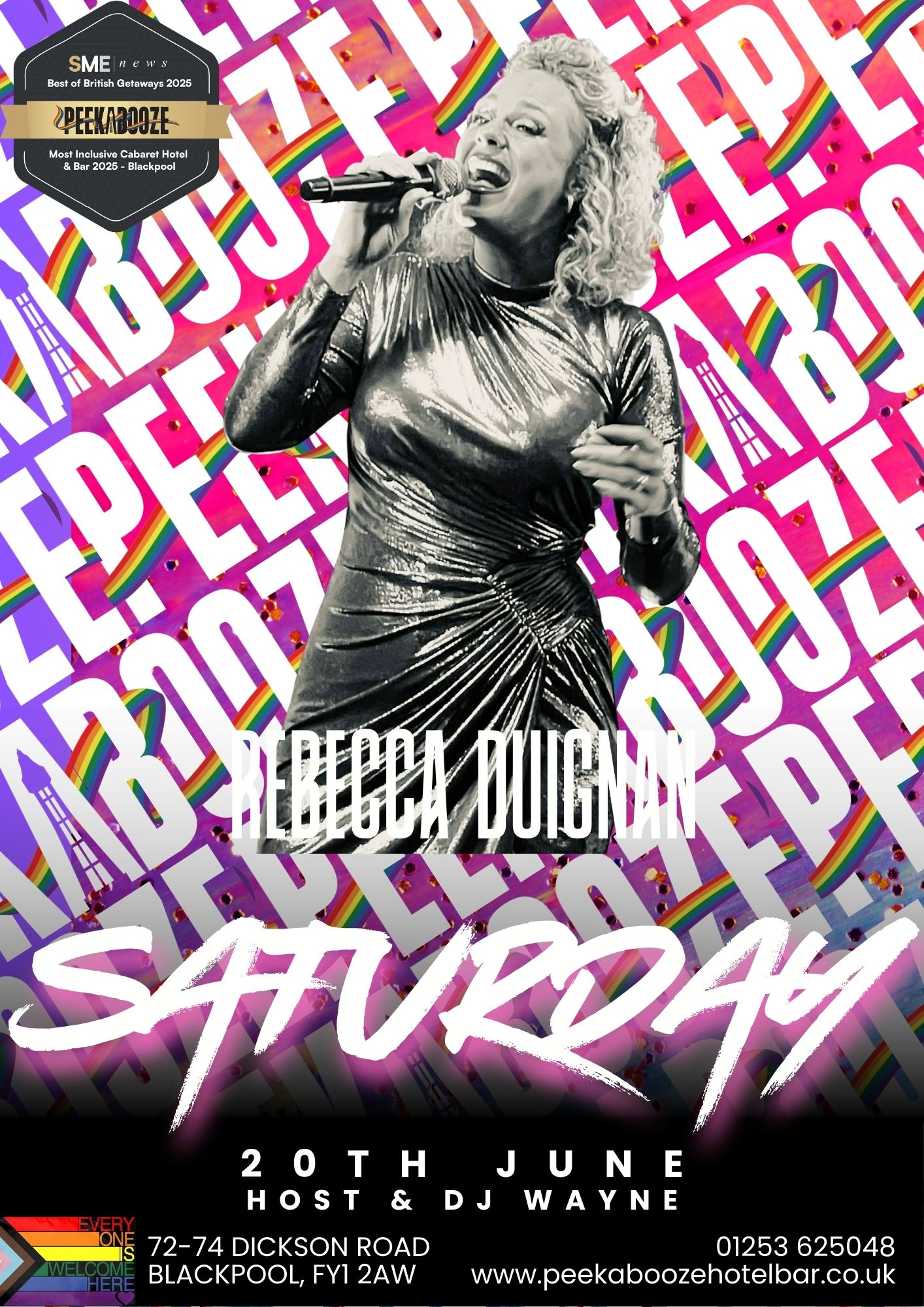 Get ready for a night that delivers pure electric energy. On Saturday 20th June, PeekaBooze proudly welcomes the sensational Rebecca Duignan — a powerhouse performer known for her sharp wit, fierce stage presence, and unforgettable entertainment.